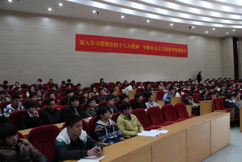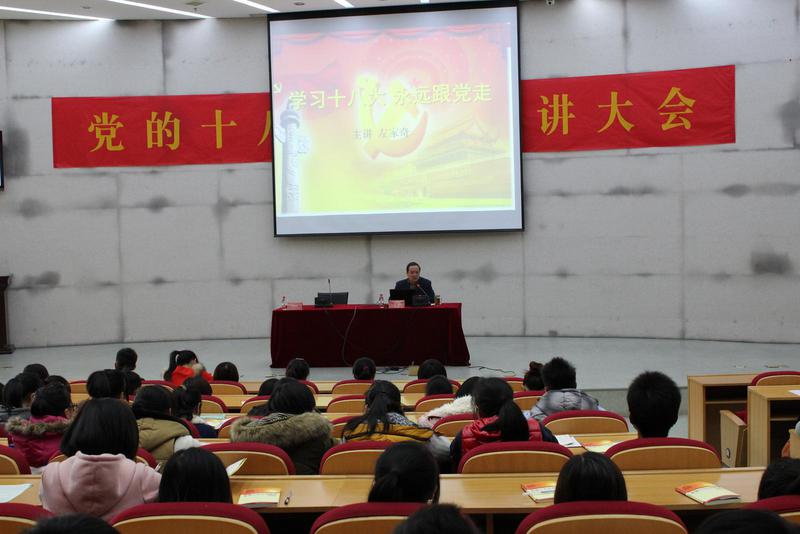 左家奇书记的报告分三个方面陈述:一,党的十八大的主要内容。深刻阐述了中国特色社会主义事业总体布局由经济建设、政治建设、文化建设、社会建设“四位一体”拓展为包括生态文明建设的“五位一体”。二,新时期共产党员的世界观人生观和价值观。三,如何按照新时期共产党员的世界观人生观价值观设计人生目标,提升思想境界。左书记在讲述理论知识的同时,也对当前国内外形势做了深刻剖析,号召全体同学要集中精力学习好专业知识与技能,为中华民族的伟大复兴贡献自己的力量。