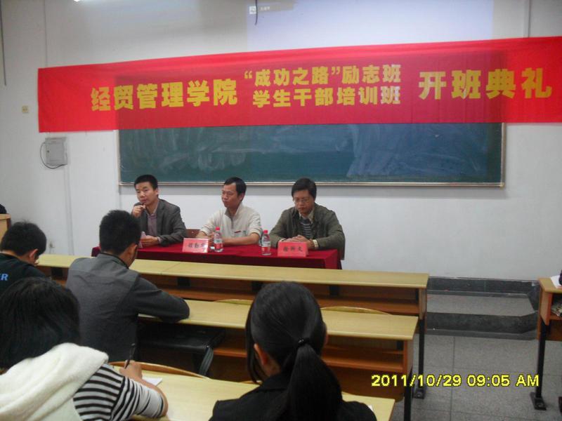 10月29日上午,我院第13期“成功之路”励志班暨学生干部培训班正式开班,出席开班典礼的领导和老师有:学院党总支书记程勤华老师,思政辅导员徐科文老师、余涛老师,开班典礼由余涛老师主持。