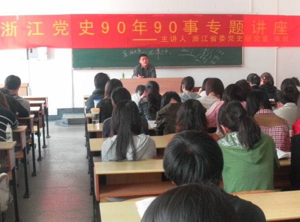 为纪念建党90周年,我院党总支邀请浙江省委党史研究室专家张昕老师为我院第27期业余党校普通班学员做专题讲座——浙江党史90年90事。张老师的报告从1921年我党建立展开,一直延伸到今年,重点讲解了在整个党史中浙江人为党的事业献身奋斗的事迹,在整个90年的历史长河中,我省涌现出的杰出人物为新民主主义革命、解放后的社会主义建设、以及改革开放作出了巨大的贡献。