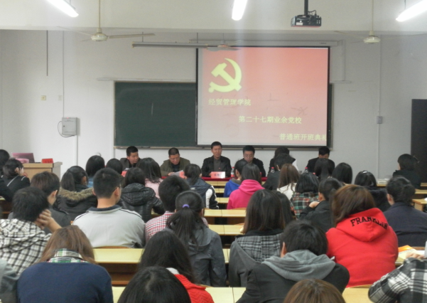 4月6日下午,我院第27期业余党校普通班在4号楼201教室隆重举行开班典礼,出席典礼的领导和老师有:学院党总支书记、业余党校校长程勤华老师,学院党总支组织兼纪检委员孙跃兰老师,学院党总支宣传委员王晓挺老师,经济类党支部书记朱爱民老师,学校党委组织部组织员林国强老师,思政辅导员余涛老师,大会由余涛老师主持。