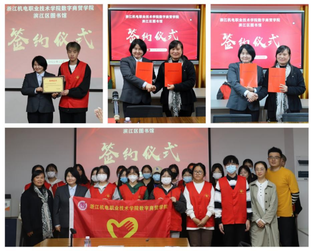 期间,双方进行了“2021年度杭州图书馆优秀志愿者团队”荣誉颁发仪式,共同签订共建志愿实践基地协议书,共建劳动教育基地协议书,并合影留念。