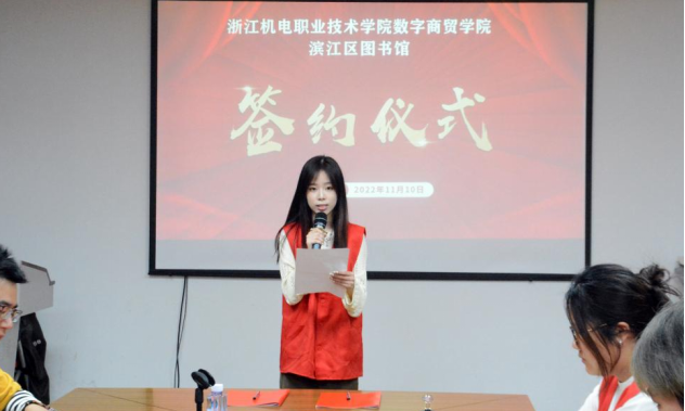 11月10日下午,数字商贸学院和滨江区图书馆共建志愿实践基地签约仪式在2-302会议室举行,参加本次仪式的有数字商贸学院党总支副书记李君,滨江区图书馆志愿者工作负责人何惠芬主任,滨江区图书馆办公室贾若雅,辅导员及学生志愿者,仪式由周晓东老师主持。