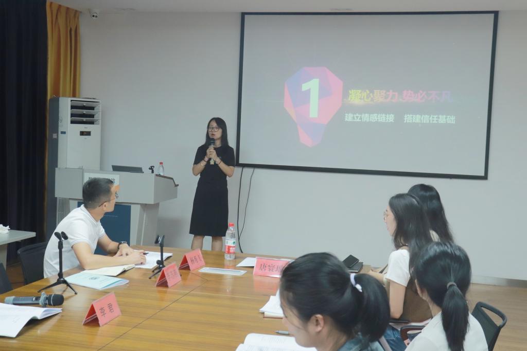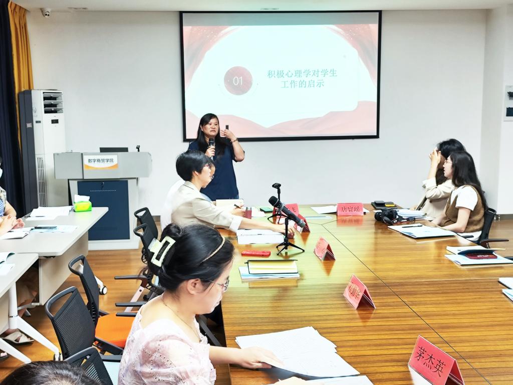 党总支副书记李君做了题为《探索基于积极心理学视域下的学生工作新模式》的报告。李君首先对学院本学期学生情况和学生特点做了介绍,她强调,我院学生生源结构复杂,性别特征显著,学生自我意识较强,班主任工作中需要注意方式方法。此外,李君基于“积极心理学”内涵对班主任工作和学生工作的重点任务进行了逐一解析,帮助班主任老师理清工作思路,助力学生培养积极人格。