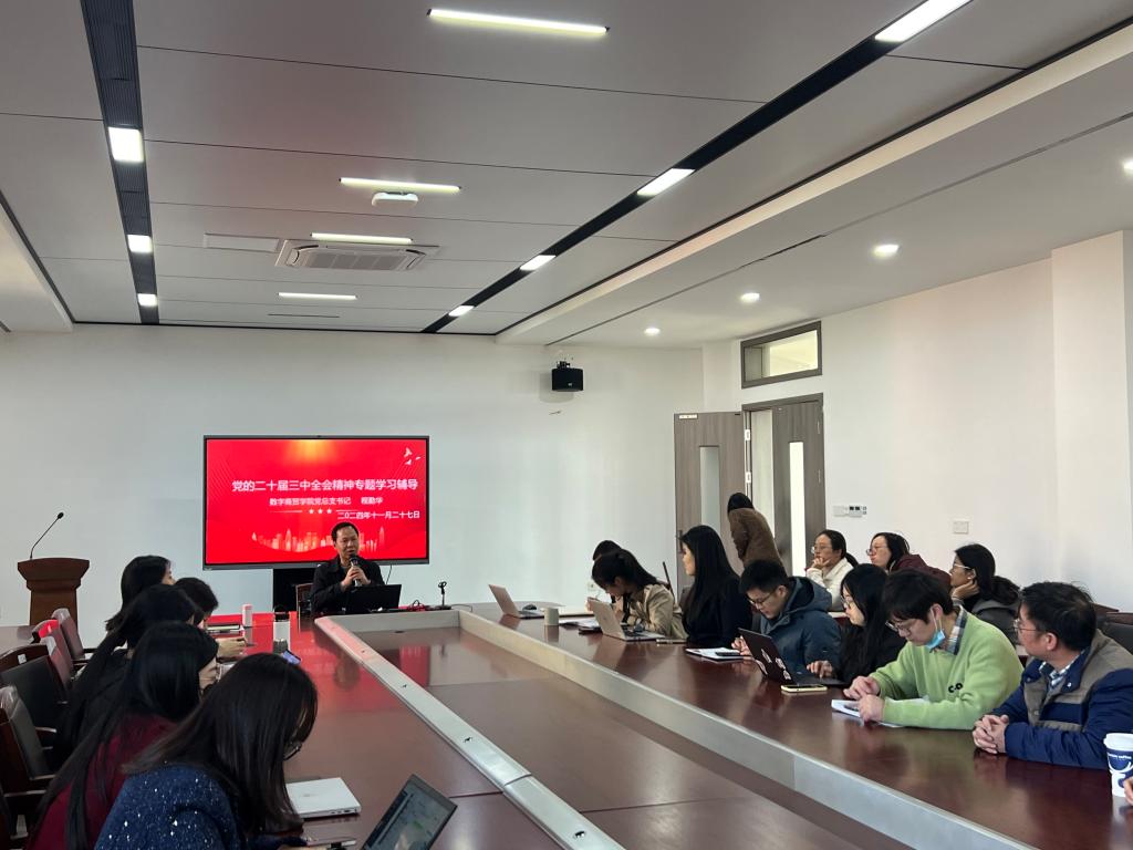 2024年11月27日下午,数字商贸学院在海宁校区21-205会议室举行思想政治学习会议。此次会议旨在深入学习并贯彻中国共产党第二十届中央委员会第三次全体会议的精神,以“数读党的二十届三中全会公报”为主题,由党总支书记程勤华主持,全体教职工参加会议。