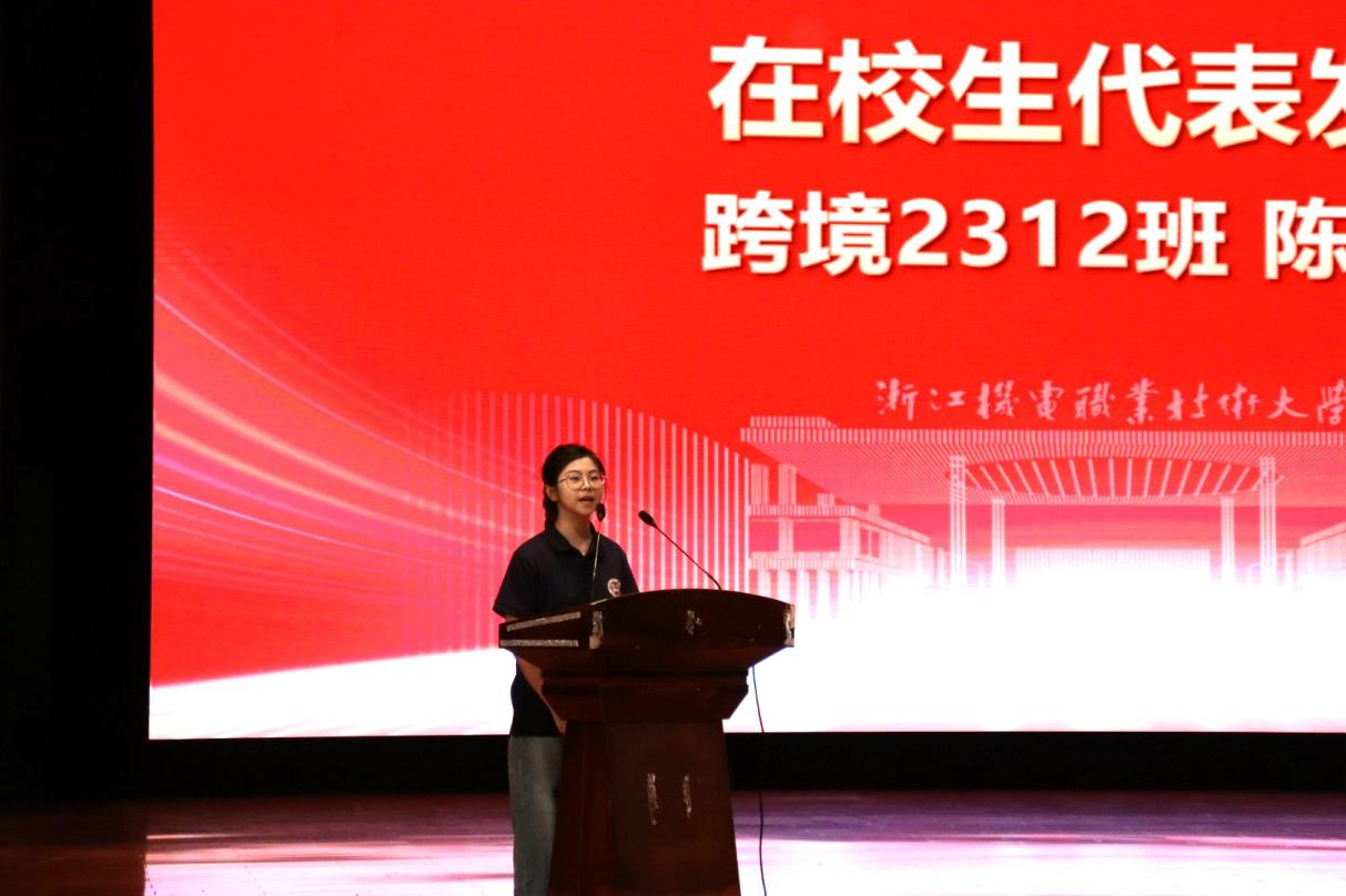 跨境2312陈嘉怡作为老生代表发言,鼓励新生们学好专业知识、突破成长边界、积极参与实践活动,在数字商贸学院锚定方向,展示自我。