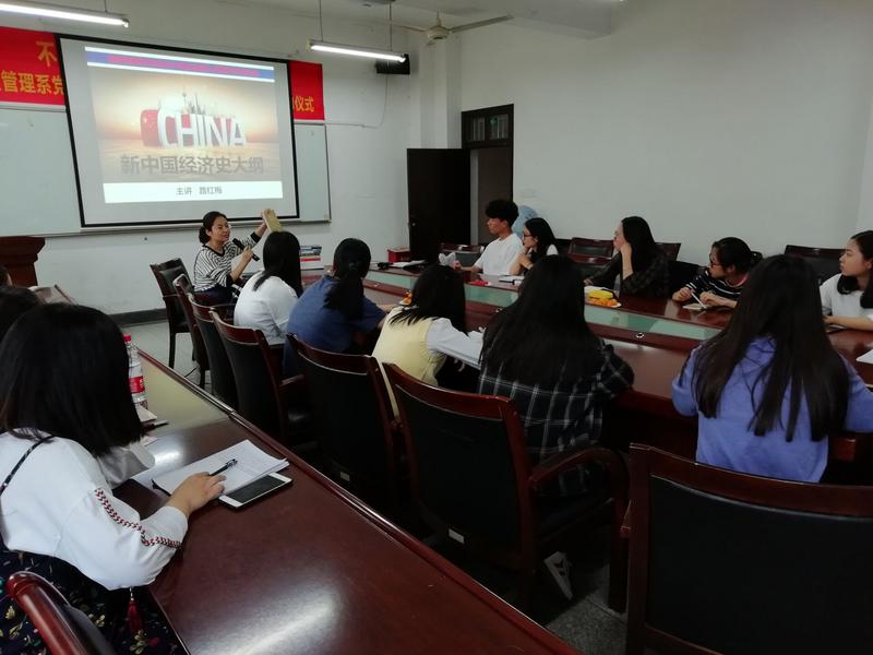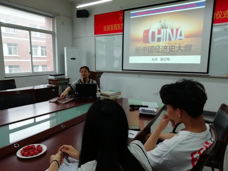 活动一开始由支部宣传委员路红梅老师给同学做了题为《新中国经济史大纲》的讲座,路老师就研究中国的方法、改革开放、中国特色的市场经济、面向未来、中国改革的前瞻性思考这几个部分内容展开了详细的讲解。路老师的讲座结束后,同学们围绕中美贸易及其对双方的影响进行了热烈讨论。