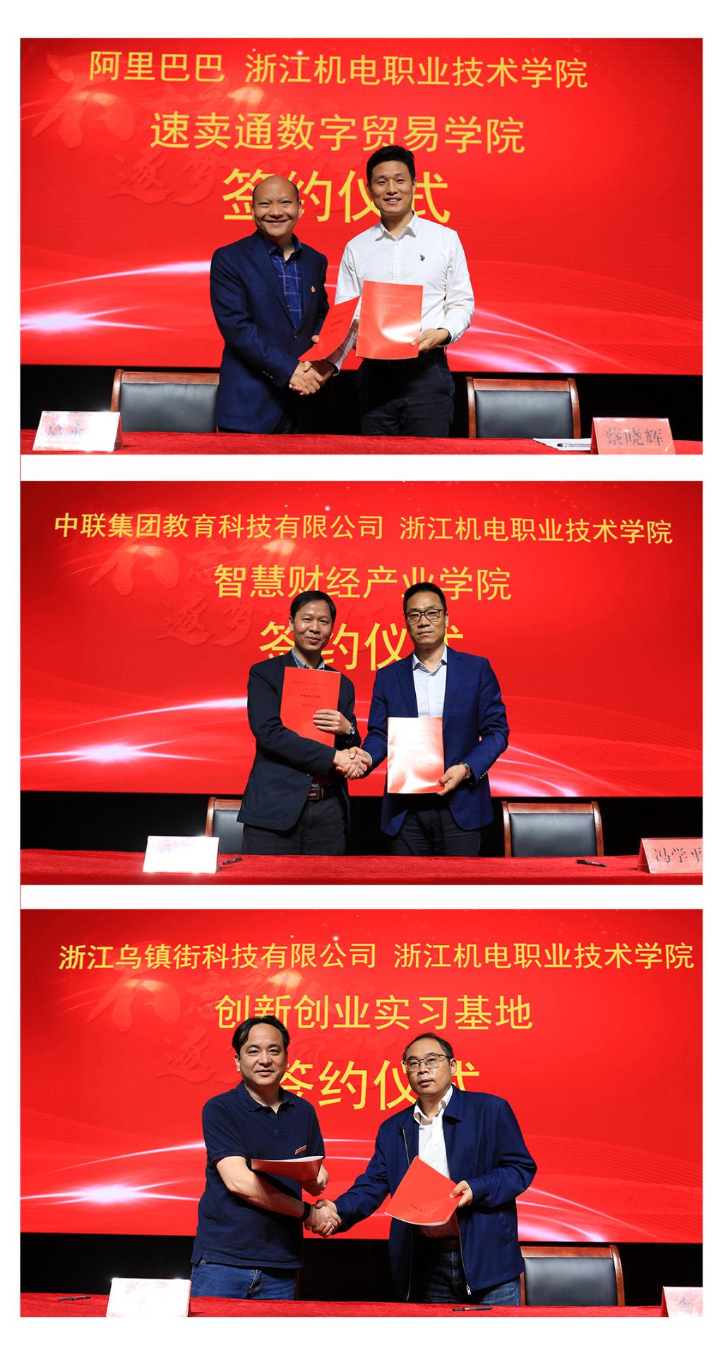 会上,数字商贸学院与阿里巴巴集团、中联集团教育科技有限公司、浙江乌镇街科技有限公司分别签署了校企战略合作协议。同时,浙江机电职业技术学院阿里巴巴速卖通数字贸易学院、中联集团教育科技有限公司智慧财经产业学院正式签约,校企双方将本着“平等互利、资源共享、共谋发展”的原则,共同推进产教深度融合,更好地服务社会经济发展,在高水平专业群、高水平产教基地等领域合力建设,深化产教融合校企合作,共绘数字商贸新蓝图。