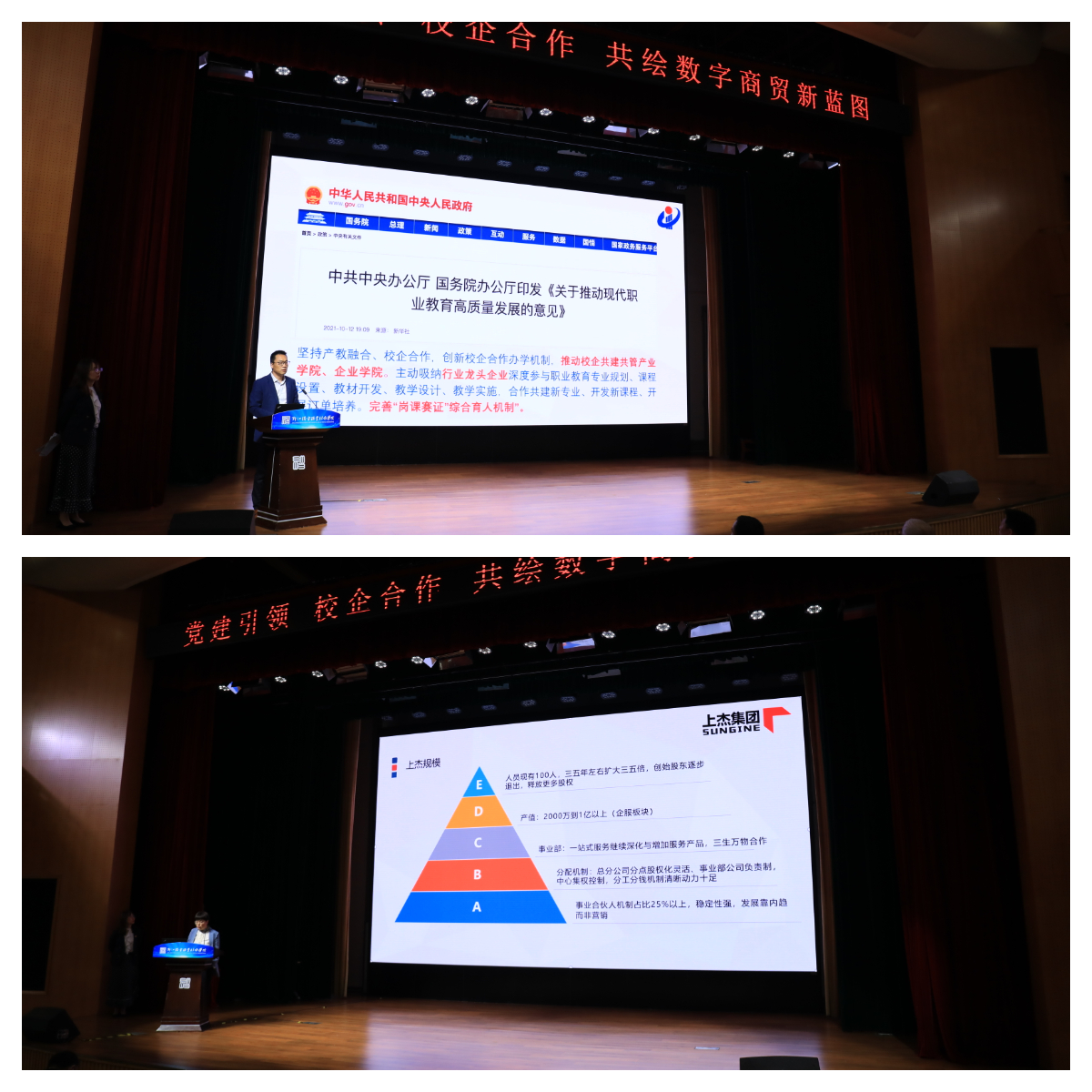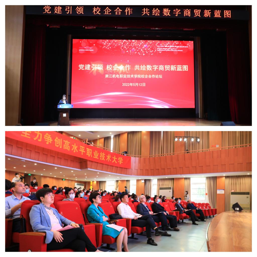 浙江机电职业技术学院院长贺星岳,《党建好故事》创作编辑研究中心主任总编辑蒋鑫富,阿里巴巴全球速卖通政府事务总监蔡晓辉中联集团教育科技有限公司副总裁冯学平,海盟控股集团有限公司集团轮值总裁倪华芬,杭州上杰控股集团董事长陈国琴,杭州紫驰网络科技有限公司总经理汤琳宏,浙江乌镇街科技有限公司董事长李立新,新道科技股份有限公司浙江省总经理吕京波四维生态科技(杭州)有限公司总经理营销总监霍田宁,杭州辉桐科技有限公司总经理吴佳裔,杭州富凌科技有限公司董事长黄晓刚等20余位企业代表,以及数字商贸学院师生代表济济一堂,共同探讨校企合作新模式,描绘数字商贸新蓝图。合作论坛由数字商贸学院互联网营销师全国技术能手陈娟主持。