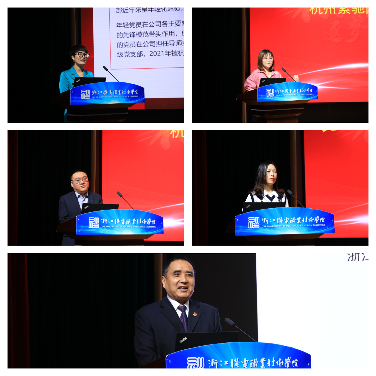 阿里巴巴速卖通数字贸易学院负责人周丽女士就国际贸易产业发展趋势、人才需求以及阿里巴巴速卖通数字贸易学院的运营与机制建设作了专题报告。中联集团教育科技有限公司副总裁冯学平作了《深化产教融合,共建产业学院》报告,从人才培养模式创新、教材与教法改革、校企合作课程、高水平教师队伍、产教整合实训基地、科技创新平台、创新创业孵化基地、产学研服务平台等八大任务,分享企业的产业链与高职院校的专业链融合的做法。海盟控股集团有限公司集团轮值总裁倪华芬作为“杭州市先进党组织”的典型代表,作了《党建引领产教融合,打造校企合作新样板》的专题报告,分享了企业党建做实了就是生产力、做强了就是竞争力、做细了就是凝聚力的实践经验。