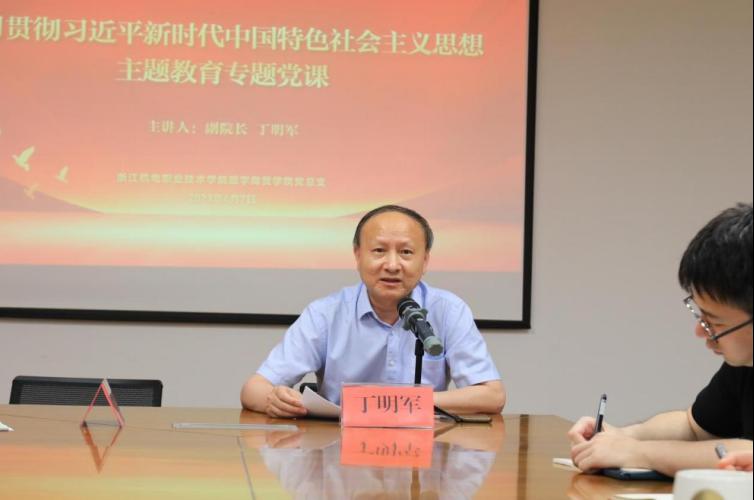为深入开展学习贯彻习近平新时代中国特色社会主义思想主题教育,6月7日下午,校党委委员、副院长丁明军以《深学悟思想,奋发开新局》为题,为数字商贸学院全体党员讲授学习贯彻习近平新时代中国特色社会主义思想主题教育专题党课,数字商贸学院党总支书记程勤华主持。