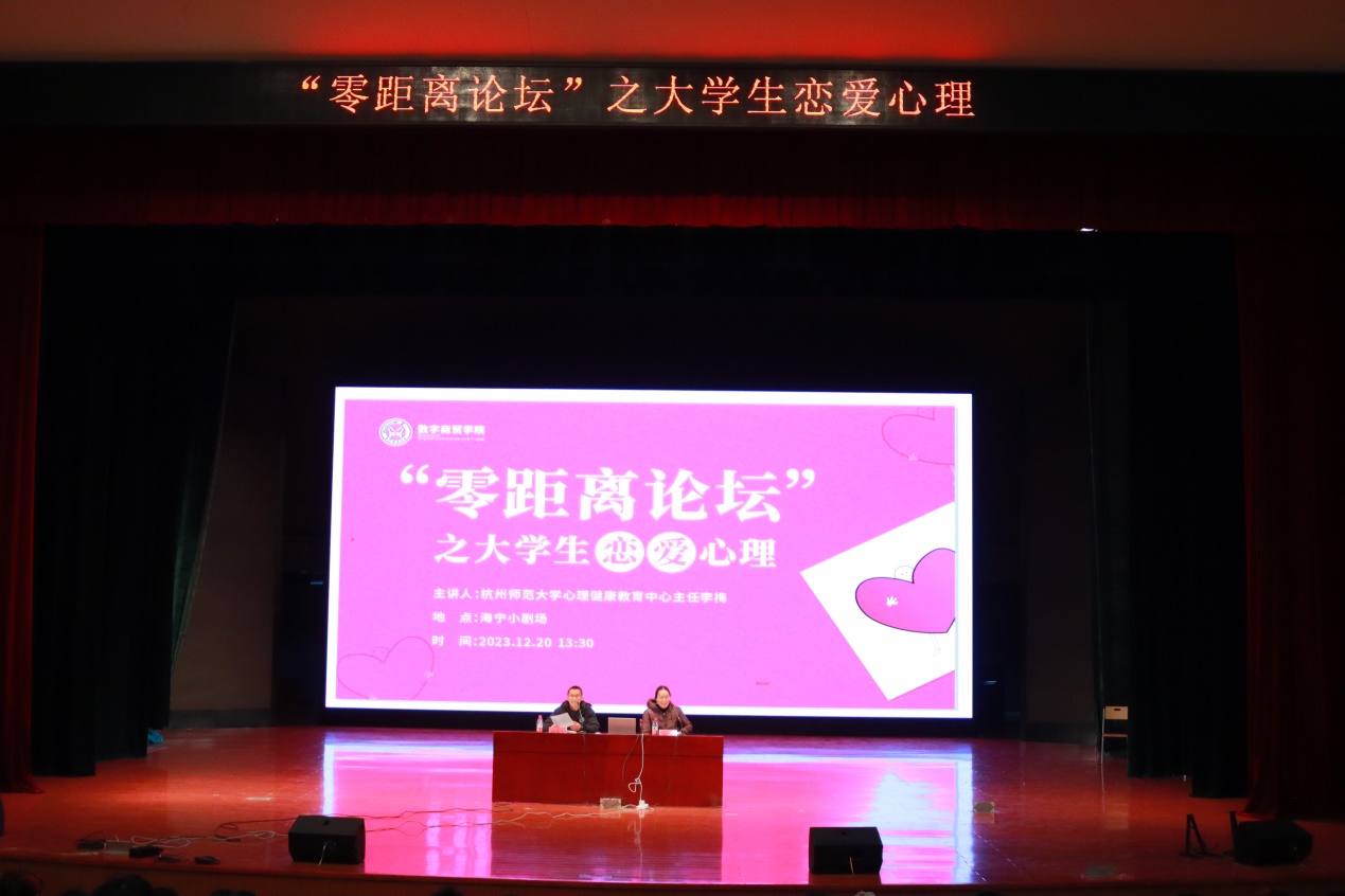 莎士比亚曾说:“爱情是生命的火花”。对于大学生而言,它充满魅力,拨人心弦,令人寻觅和向往,然而,由恋爱引发的问题也会严重影响到学习、生活乃至大学生人格的健康发展。为进一步引导大学生关注积极的恋爱心理,12月20日下午,学院邀请杭州师范大学心理健康教育与咨询中心主任李梅在海宁校区小剧场开讲,学院守望者身心健康发展协会会员和500余名2023级同学共同聆听讲座,讲座由学工办主任杨秀飞主持。