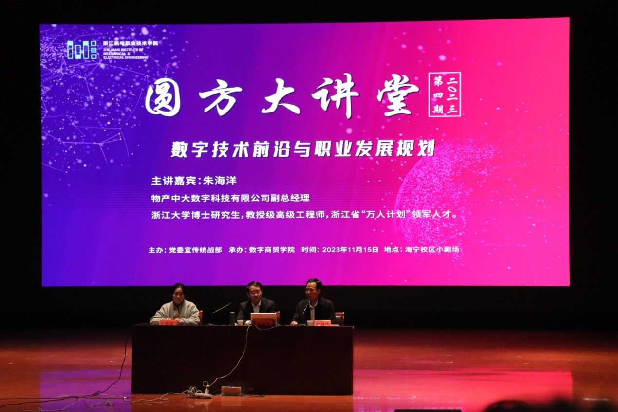 11月15日,浙江机电职业技术学院于海宁校区剧场举行2023年第四期圆方大讲堂。本期大讲堂由党委宣传统战部主办,数字商贸学院承办,特邀省“万人计划”科技创新领军人才、教授级高级工程师、浙江大学朱海洋博士作题为《数字技术前沿与职业发展规划》的专题讲座,讲座由数字商贸学院党总支书记程勤华主持,学院辅导员和学生代表500余人共同聆听本次讲座。
