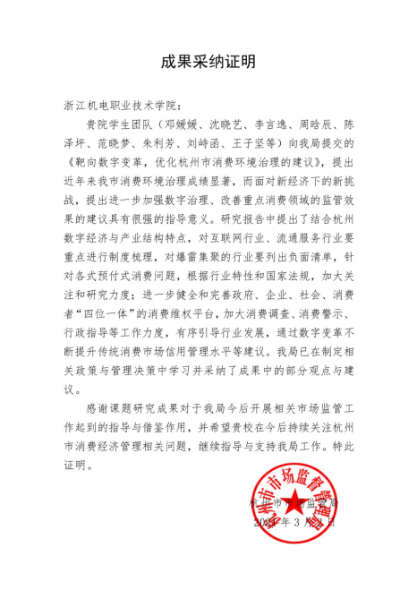 近日,学院收到中国民主促进会浙江省委员会发来的录用通报,我院杨敏教授报送的《扩大生物制品简易征收享受范围的建议》先后被浙江省委统战部、全国政协录用并转送国家相关部委办局。