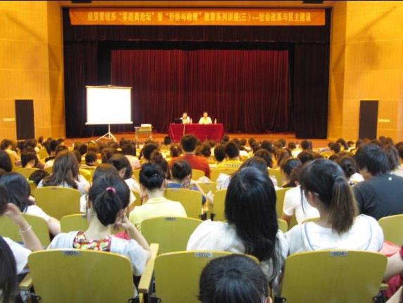 2010年5月26日,经贸管理系“零距离”论坛暨形势与政策教育系列讲座之三:社会改革与民主建设在五号楼报告厅举行,经贸管理系、基础部特邀浙江大学博士生导师、国务院政策研究中心特约研究员段治文教授担任主讲。