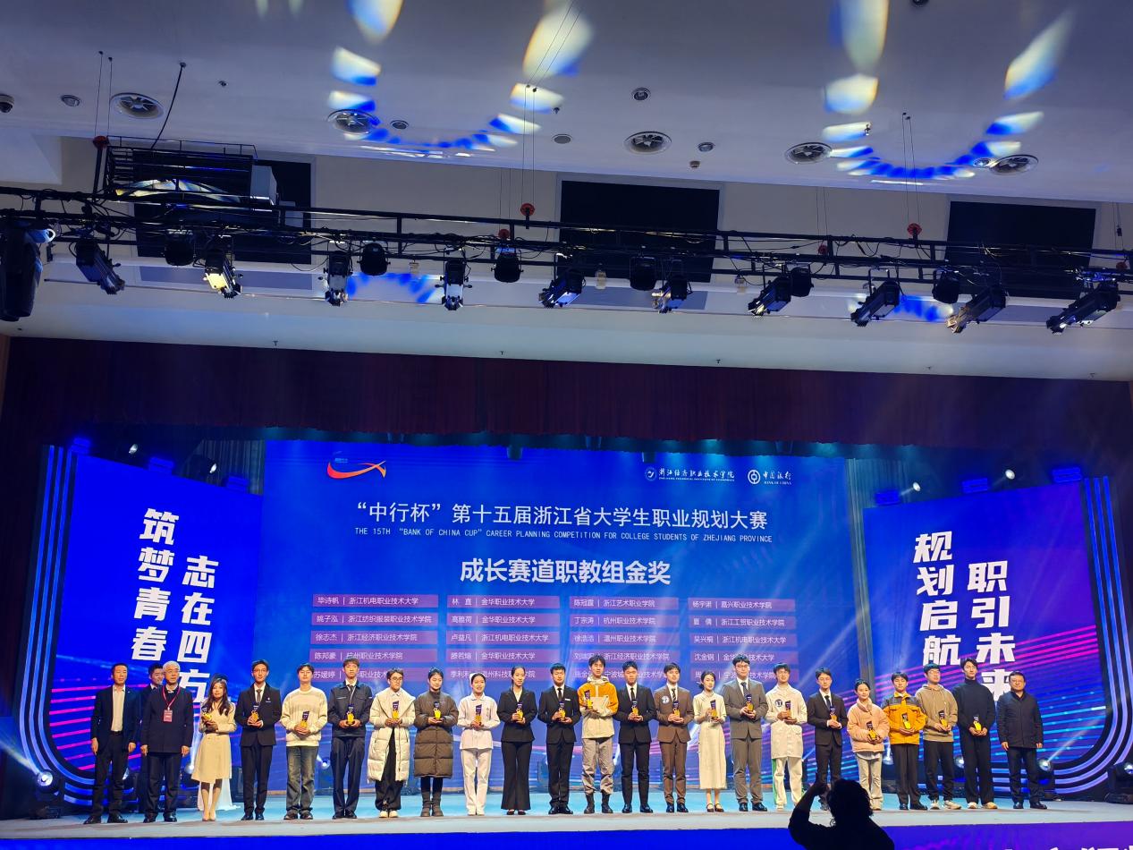 12月27日,由浙江省教育厅主办,浙江省教育发展中心、浙江经济职业技术学院共同承办的“中行杯”第十五届浙江省大学生职业规划大赛决赛和颁奖典礼落下帷幕。我院参赛选手汽智2301班毕诗帆在“成长赛道”中斩获金奖并位列成长赛道职教组第一名(共50名选手),城电2301班陈楚锋在“成长赛道”中获优胜奖。