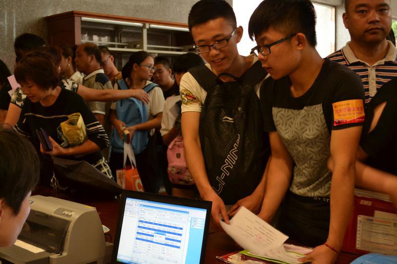 早上七点钟,学生会的同学们已经来到迎新地点进行布置,半个小时后全部迎新队伍便已全部到齐“严阵以待”。他们有的在接待处耐心地接受家长和新同学的咨询,有的微笑着为学弟学妹办理手续,还有部分同学因场地有限一直默默地坐在台阶上等待着新同学办理完手续便带领他们前往宿舍区。男生寝室较远所以接送的同学们都相当辛苦,一天结束平均每人下来来回跑了四五趟,甚至在最炎热的中午也主动积极地接过新生的行李,毫无怨言。
