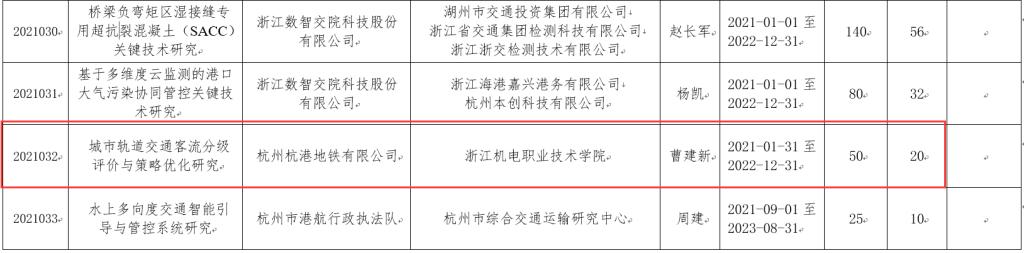 根据浙江省交通运输厅《省交通运输厅关于下达2021年度科技计划项目的通知》(浙交发函〔2021〕55号)文件公布结果,我院与杭州杭港地铁有限公司合作开展的科研项目《城市轨道交通客流分级评价与策略优化研究》入选2021年度浙江省交通运输厅科技计划项目,项目研究期限为2021年1月31日至2022年12月31日,项目获有关单位投资额、补助额分别为50万元、20万元。