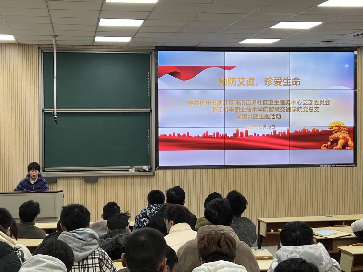 12月20日晚,智慧交通学院与浦沿街道社区卫生服务中心在四号楼一楼扇形教室共同举办以“预防艾滋,珍爱生命”为主题的讲座。 此次讲座是我院与浦沿街道社区卫生服务中心党建共建活动之一,旨在充分发挥党建引领作用,积极有效促进党建工作与学生身心健康相融合,提高广大师生对艾滋病的认识,加强预防意识,共同维护健康校园环境。