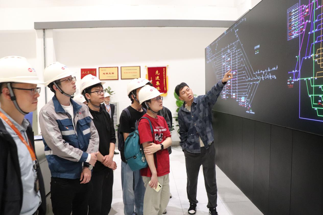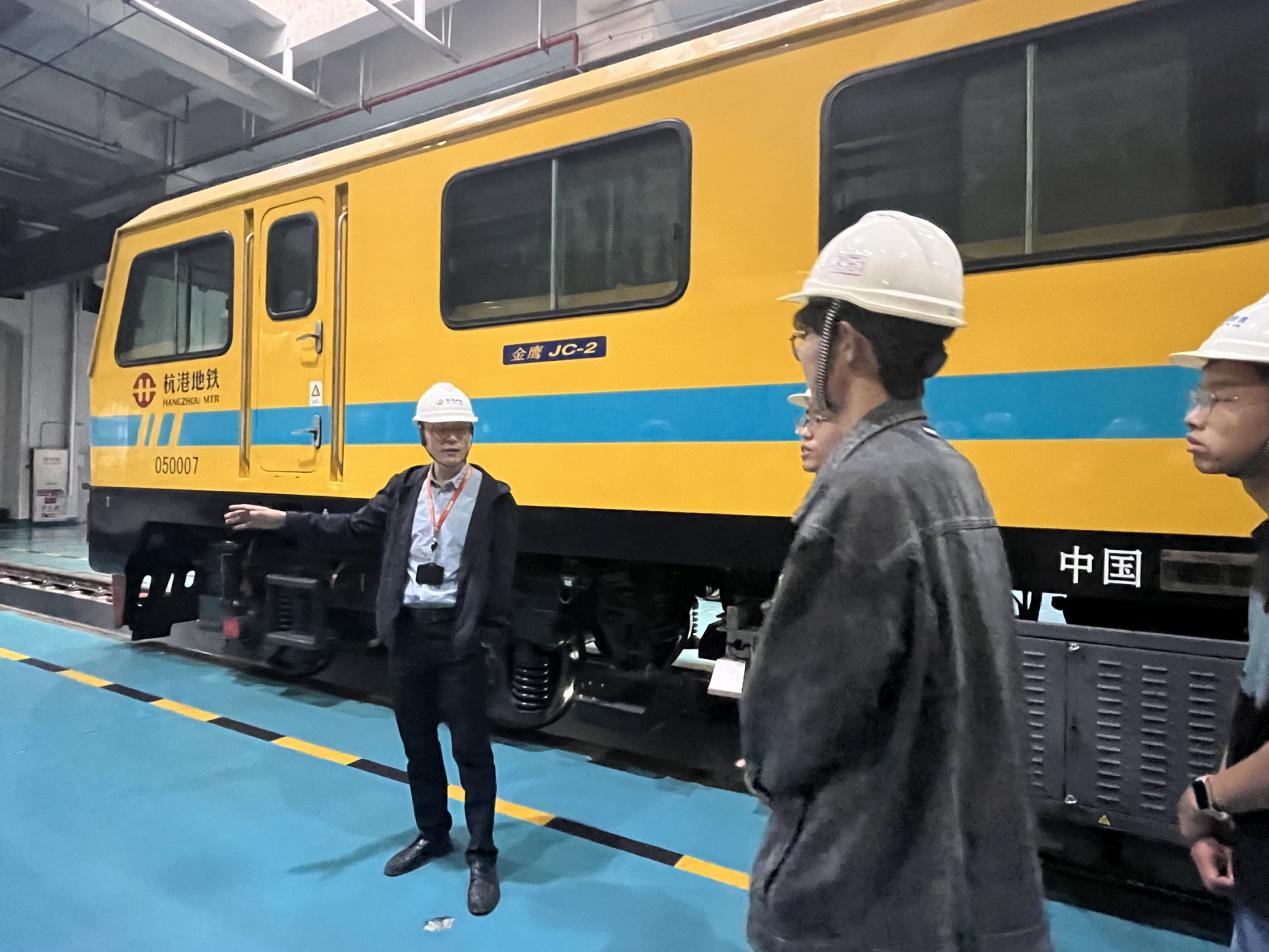 学院师生首先与杭港地铁党群办主任孙鹏,以及杭港公司测量与监测仪器经理黄小斌、轨道车维修工程师陈翔龙,全国城市轨道交通行业“维修能手”陈豪开展对话,聆听工匠故事,随后又在陈翔龙师傅的带领下,前往工程车辆段与电客车车辆段参观,陈师傅详细为同学们讲解了各种工程车的用途以及车辆段各部门的运行模式,同学们一边认真聆听一边询问陈师傅各类专业问题,表示今天亲眼看到车辆段控制中心大屏调度系统,才真正明白了‘毫秒级响应’对地铁安全运行的意义。