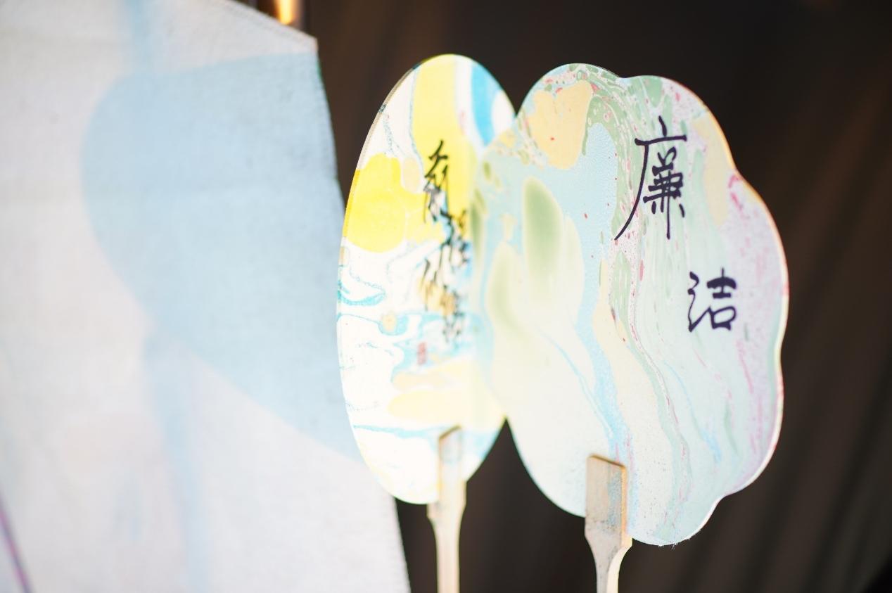 漆扇绘制区则洋溢着传统艺术的雅致气息。同学们精心调配色彩,在扇面上描绘荷花、山水、青松等颜色。漆液在扇面上自然流淌形成的独特纹理,恰似廉洁精神在生活中的自然渗透。每一把扇子的纹理都是独一无二的,就像每个人对廉洁的理解和实践也各有特色。
