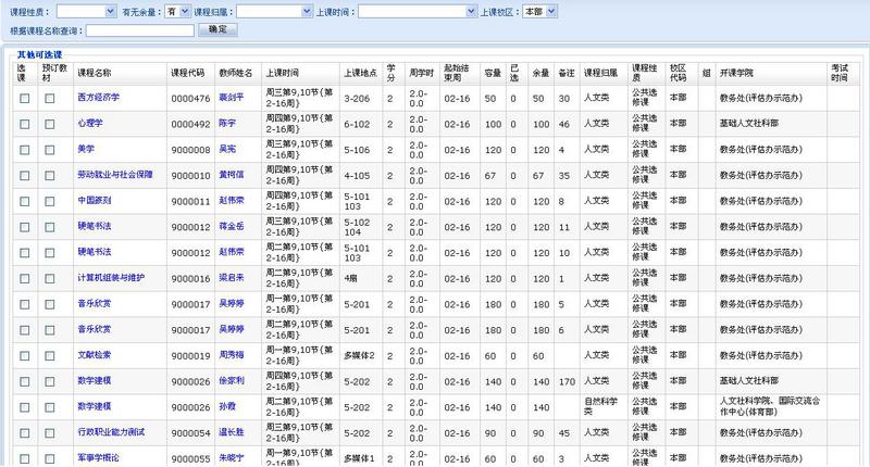 5、提醒学生在报选过程中注意课程的上课时间、地点,本学期选修课分两校区开设。