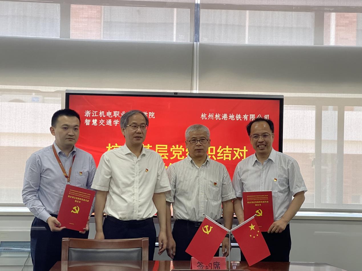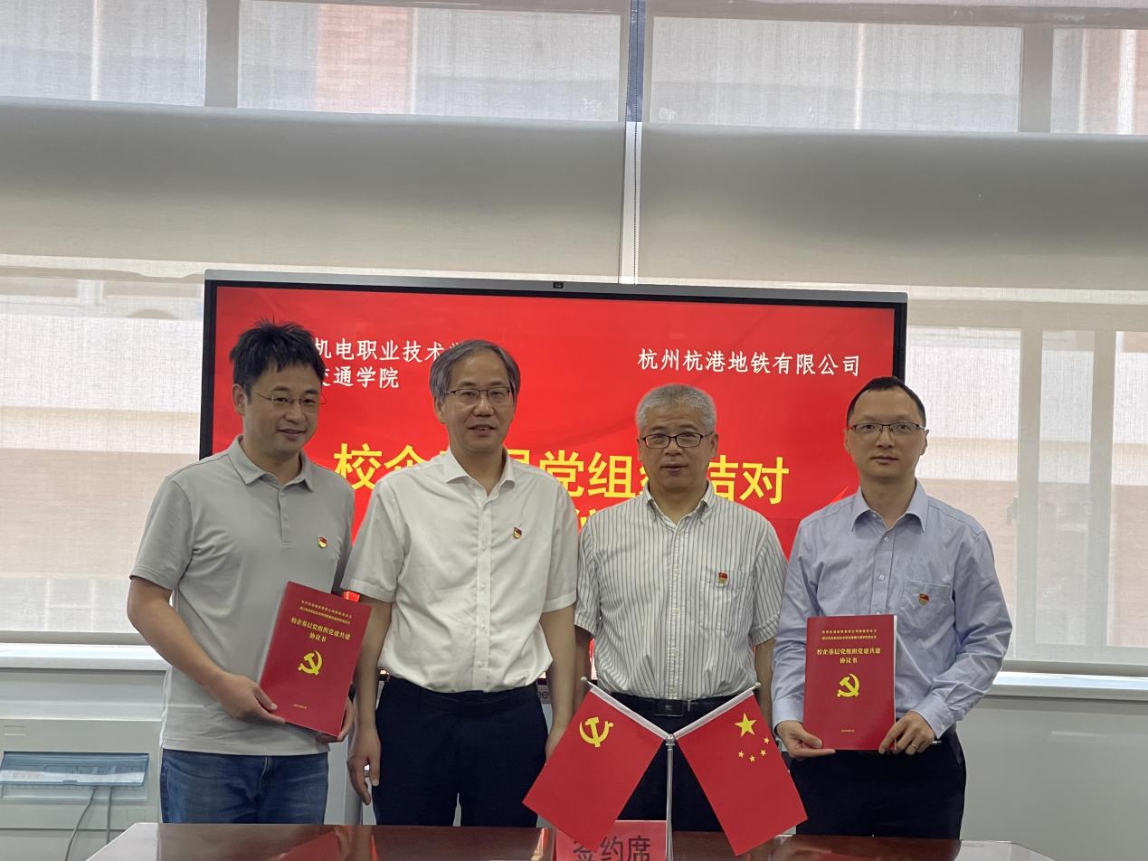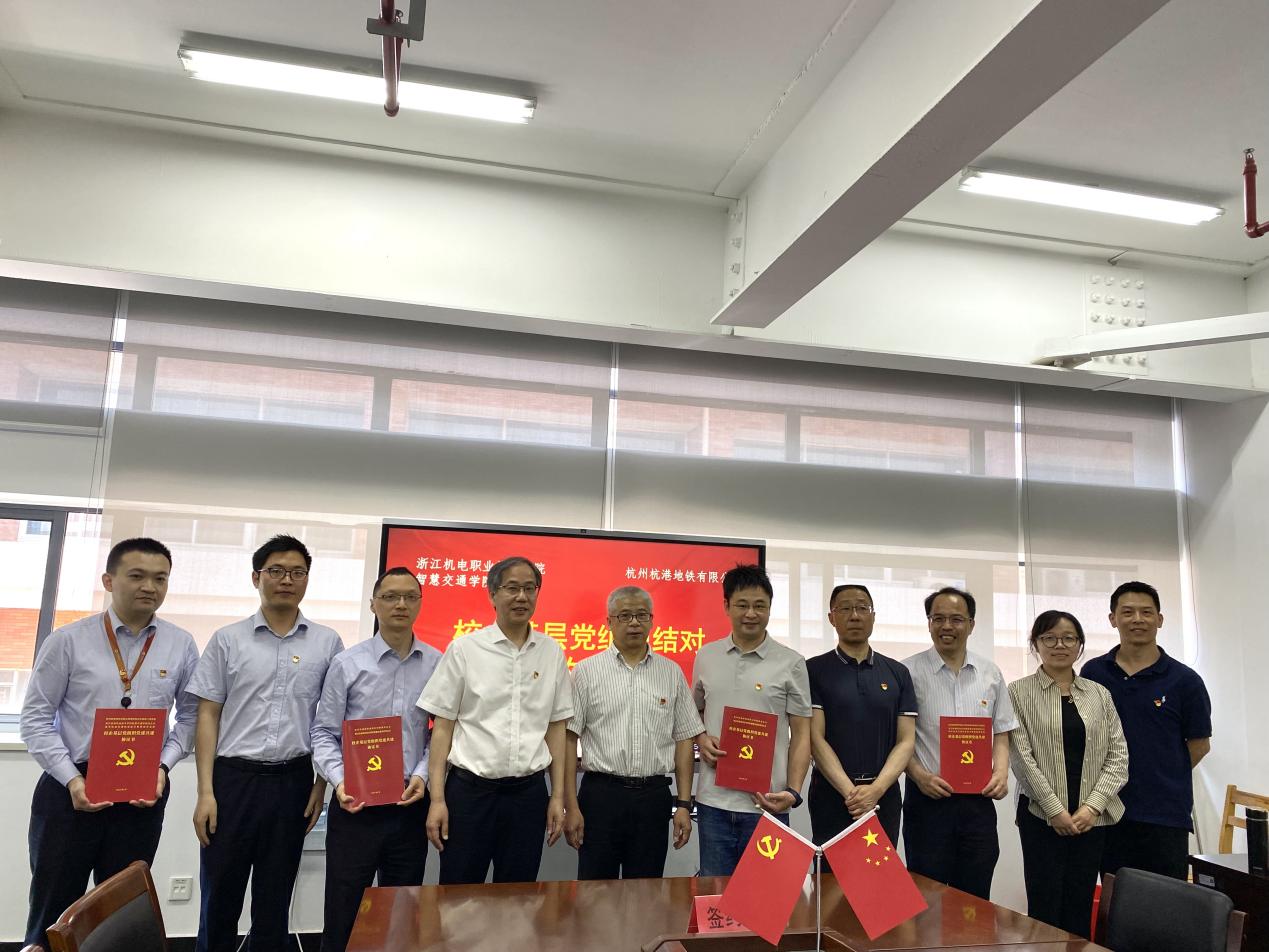 为深入学习贯彻党的二十大精神和习近平总书记关于党的建设的重要思想,不断增强党组织政治功能和组织功能,持续创新基层党建工作载体,深化校企合作、推动产教融合,携手共促校企双方高质量发展。浙江机电职业技术学院智慧交通学院和杭州杭港地铁有限公司本着“优势互补、资源共享、校企联动、聚力发展”的原则,于5月14日在浙江机电职业技术学院15号楼党员之家举行“党建结对共建”签约仪式。杭州杭港地铁有限公司党委书记、副总经理吴国仁,党委委员、工程副总管邓伦津,党群办主任孙鹏,维修二党支部副书记、车站维修经理鲍奕俊;浙江机电职业技术学院党委委员、纪委书记王斌,智慧交通学院党总支书记黄柯信,院长倪勇,城市轨道交通机电技术教研室党支部书记王循明,支委曹昕鸷、任嘉祺参与活动,仪式由黄柯信主持。