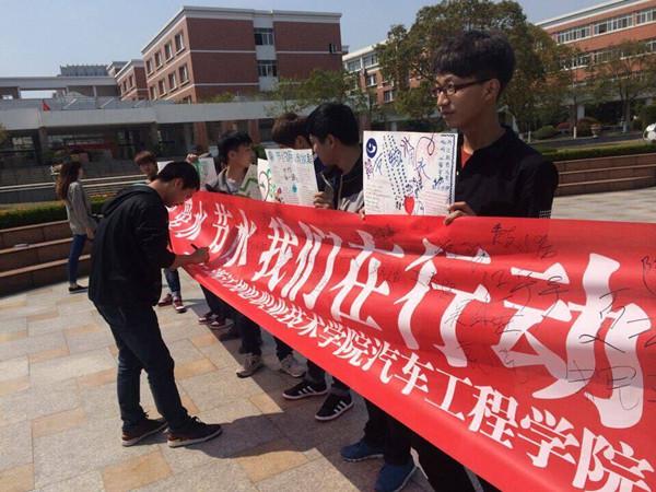 三月下旬,汽车工程学院在班级、寝室、校园内不断加强节水宣传,使更多人参与到节水行动中。3月25日下午,由汽车工程学院宣传部以及社会实践部组成的志愿者在校图书馆前以及滨江物美超市门口进行节水宣传活动。活动中,同学们通过展示精美手抄报和分发节水倡议书等方式让民众了解到节约用水的重要性,广大群众热情参与,主动在宣传横幅上签名,表示将从自己做起,从现在做起,从点滴做起,支持节水行动。