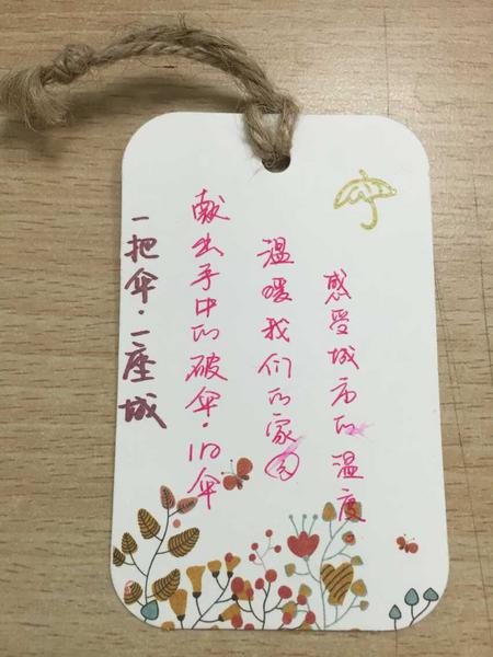 3月15日,汽车工程学院社会实践部开始征集“一把伞,一座城”宣传口号,最终汽营1331班林梦娇的宣传口号“献出手中的破伞、旧伞,温暖我们的城市,感受城市的温度”被采纳。3月26日汽车学子将口号制作成精美的书签,开始在学校、华润超市门口、物美超市前广泛宣传志愿活动。此次“一把伞,一座城”环保志愿活动得到了校领导和广大师生的肯定,邵书记、电气、金贸、汽车学院老师,各院学生及家长纷纷将家中不用的旧伞、破伞捐献出来,为城市环保出力,为城市文明助力。5月15日汽车分院社会实践部将搜集到的伞全部送往杭州市环保志愿服务总队,活动得到了杭州市环保志愿服务总队的好评,并特地通过短信形式表达对taptap点点师生环保志愿精神的肯定和赞许。
