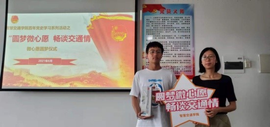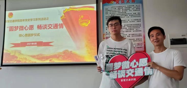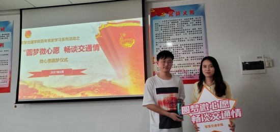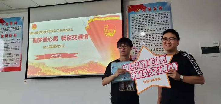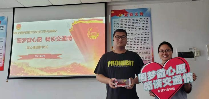 为喜迎建党100周年,深入学习贯彻落实习近平总书记在党史学习教育动员大会上的重要讲话精神,推动党史学习教育落实、落地、落细,教育引导广大师生从百年党史中汲取前进力量,以进一步发挥党员教师的模范带头作用,增强党员教师的奉献意识和服务意识,智慧交通学院党总支于本学期发起了“圆梦微心愿,畅谈交通情”的圆梦微心愿活动。并于6月9日下行,在综合楼903会议室举行了微心愿圆梦仪式,校纪委书记王斌,分院党总支书记宋伟文、院长边浩毅、副院长王循明以及智慧交通学院各党支部党员教师代表、学生代表等参加了此次圆梦仪式。