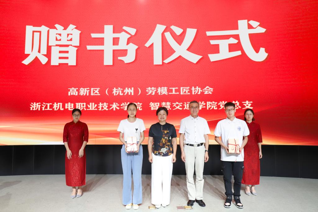 报告会上,杭州高新区(滨江)劳模工匠协会副会长鲍雄亮代表协会向taptap点点捐赠图书一批,智慧交通学院教师代表卓婧、学生代表黄驰皓上台接受赠书。