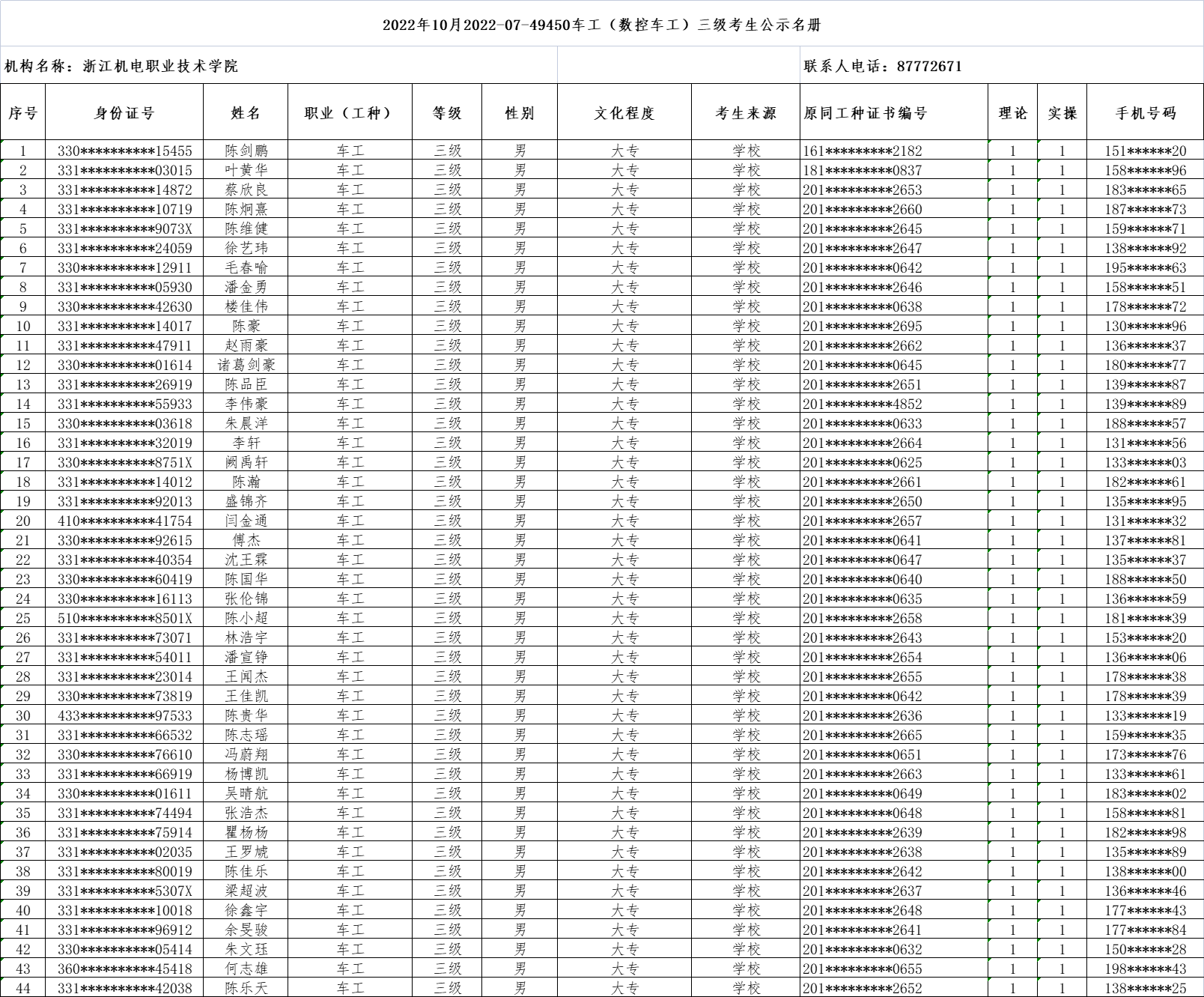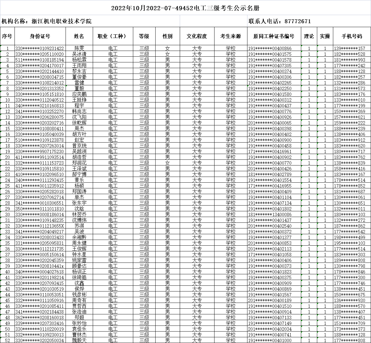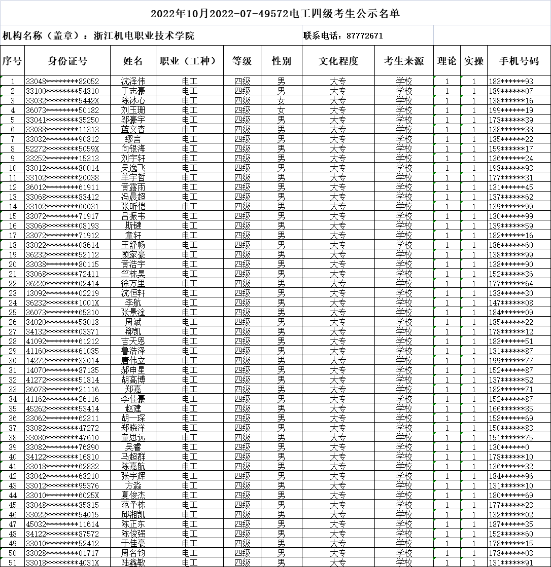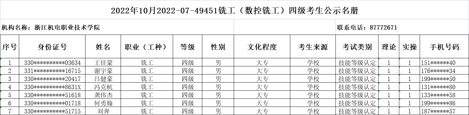 现将2022年10月电工(四级)、电工(三级)、数控车工(三级)、数控铣工(四级)职业技能等级认定考生报名结果信息予以公示,公示时间为5日(2022年9月26日-2022年9月30日)。公示期间,有任何异议可向相关部门反映,监督电话:0571-87772671;联系人:潘老师。