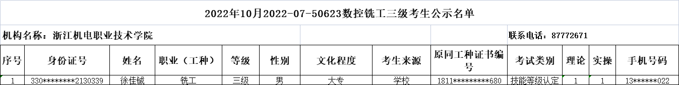 现将2022年10月数控铣工(三级)职业技能等级认定考生报名结果信息予以公示,公示时间为5日(2022年10月10日-2022年10月14日)。公示期间,有任何异议可向相关部门反映,监督电话:0571-87772671;联系人:潘老师。