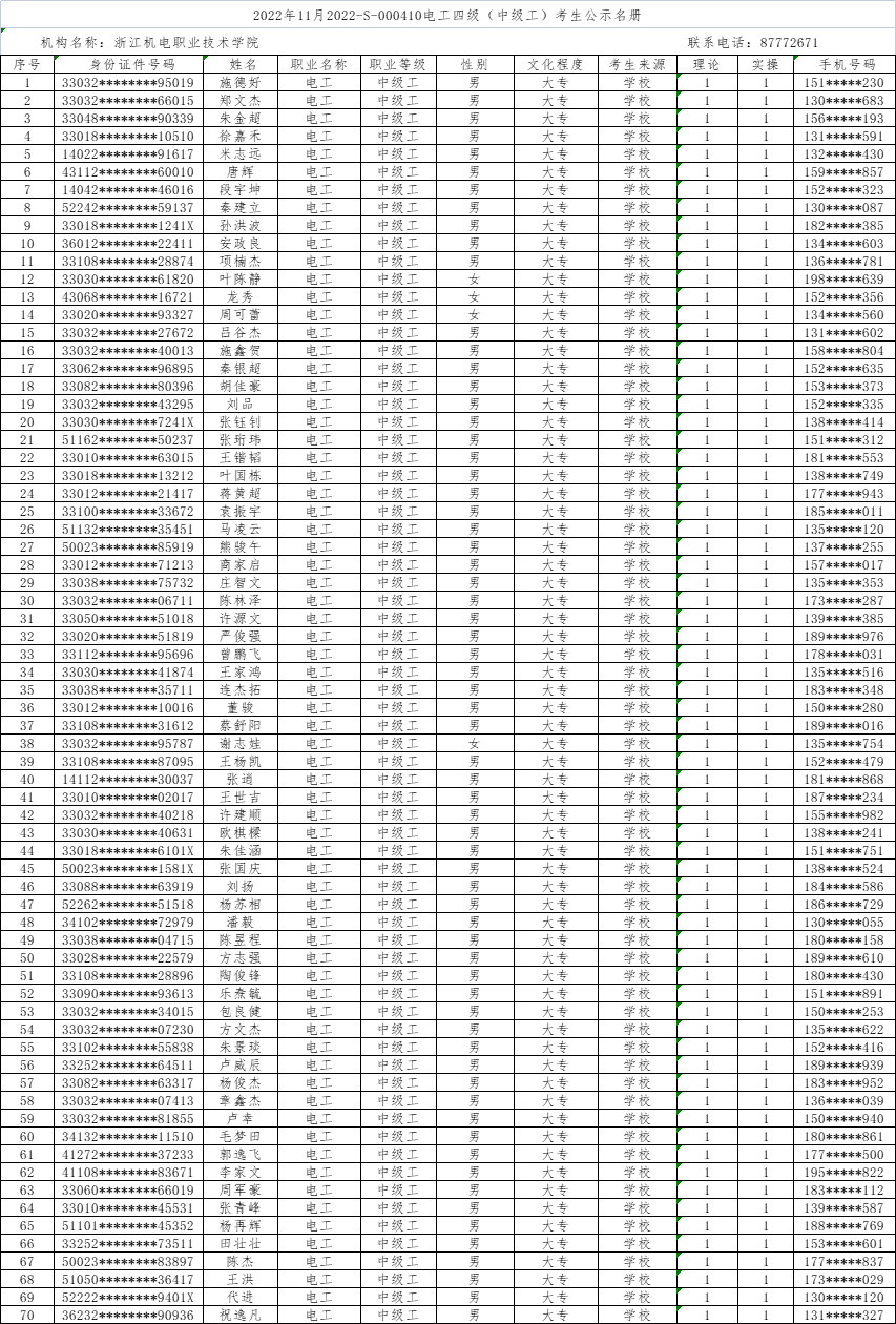 现将2022年11月电工(四级)、电工(三级)职业技能等级认定考生报名结果信息予以公示,公示时间为5日(2022年11月11日-2022年11月17日)。公示期间,有任何异议可向相关部门反映,监督电话:0571-87772671;联系人:潘老师。