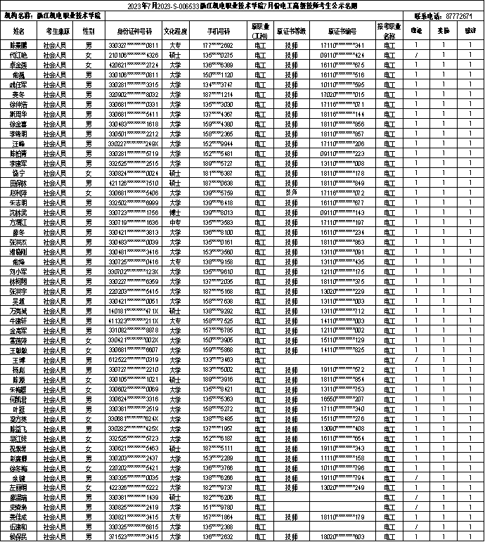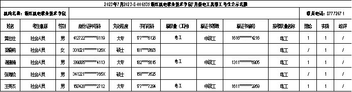 现将2023年7月电工(一级)、电工(二级)、电工(三级)职业技能等级认定考生报名结果信息予以公示,公示时间为5日(2023年7月5日-2022年7月11日)。公示期间,有任何异议可向相关部门反映,监督电话:0571-87772671;联系人:项老师。