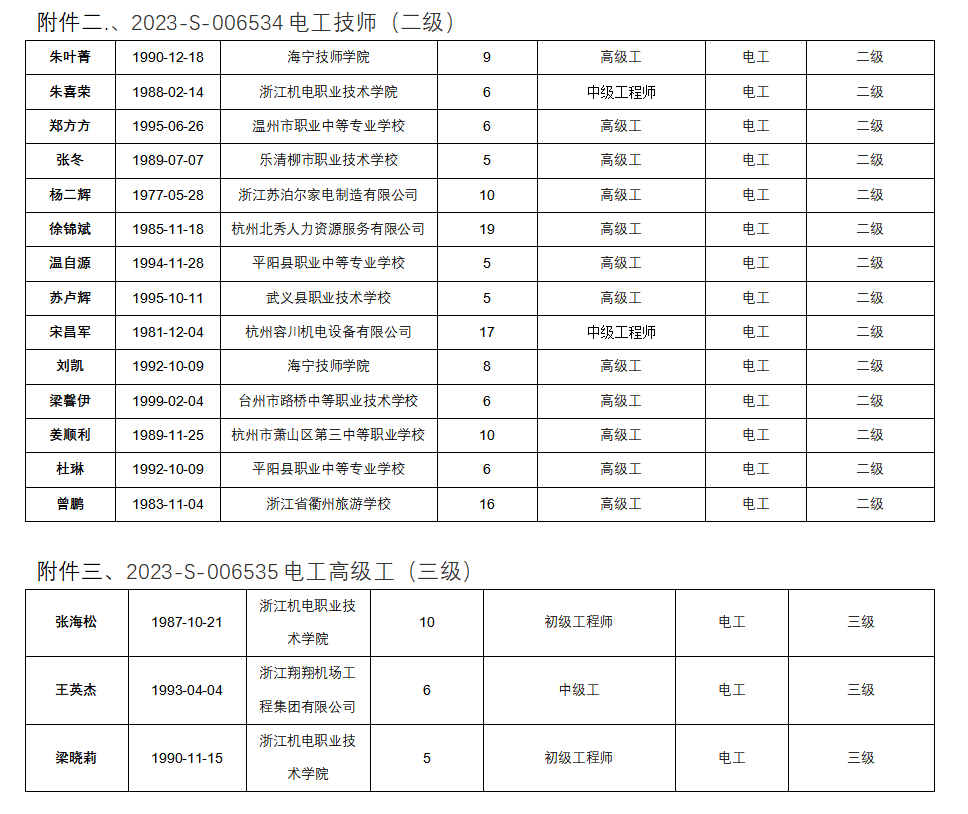 现将计划号2023-S-006533电工高级技师(一级)、计划号2023-S-006534电工技师(二级)、2023-S-006535电工高级工(三级)职业技能等级认定考生合格人员信息(详见附件)予以公示,公示期为5天(2023年8月02日----2023年8月08日)。公示期间, 有任何疑义可向相关部门反映,监督电话:0571-87772671。