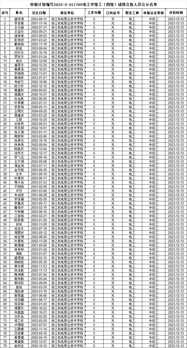 现将计划号2023-S-011766电工高级工(三级)、2023-S-011765电工中级工(四级)职业技能等级认定考生合格人员信息(详见附件)予以公示,公示期为5天(2023年12月20日----2023年12月26日)。公示期间,有任何疑义可向相关部门反映,监督电话:0571-87772669。