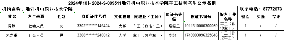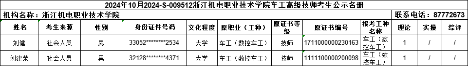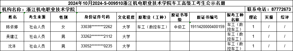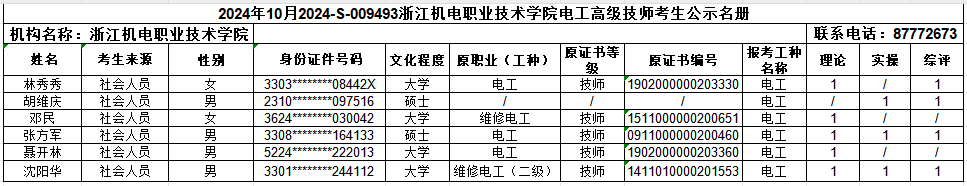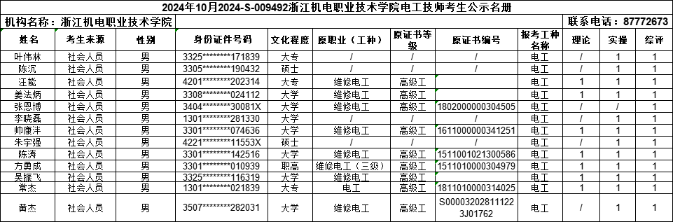现将2024年10月电工(一级)、电工(二级)、电工(三级)、车工(一级)、车工(二级)、车工(三级)职业技能等级认定考生报名结果信息予以公示,公示时间为:2024年10月1日-2024年10月12日。公示期间,有任何异议可向相关部门反映,监督电话:0571-87772673;联系人:熊老师。