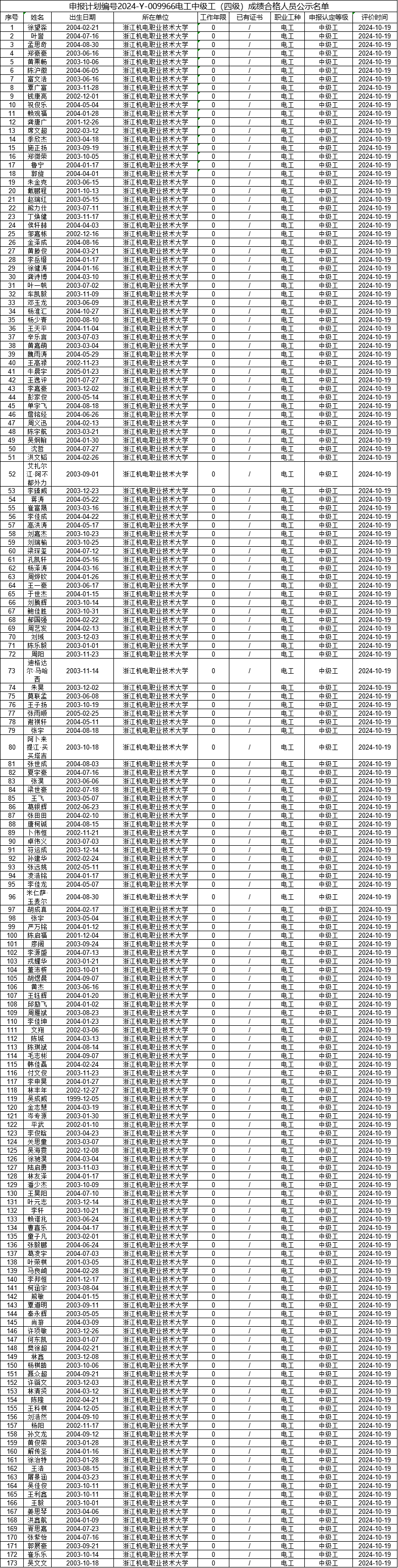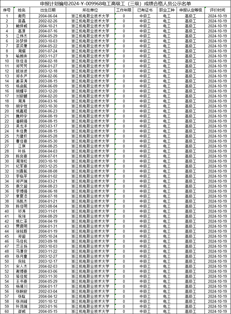 现将计划号2024-Y-009966电工中级工(四级)、2024-Y-009968电工高级工(三级)职业技能等级认定院校学生考生合格人员信息(详见附件)予以公示,公示期为(2024年10月24日----2024年10月30日)。公示期间,有任何疑义可向相关部门反映,监督电话:0571-87772673。