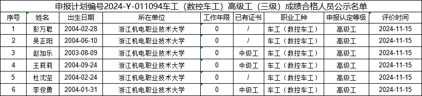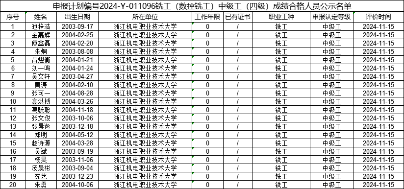 现将计划号2024-Y-011094车工(数控车工)高级工(三级)、2024-Y-011096铣工(数控铣工)中级工(四级)职业技能等级认定考生合格人员信息(详见附件)予以公示,公示期为(2024年11月21日----2024年11月27日)。公示期间,有任何疑义可向相关部门反映,监督电话:0571-87772669。