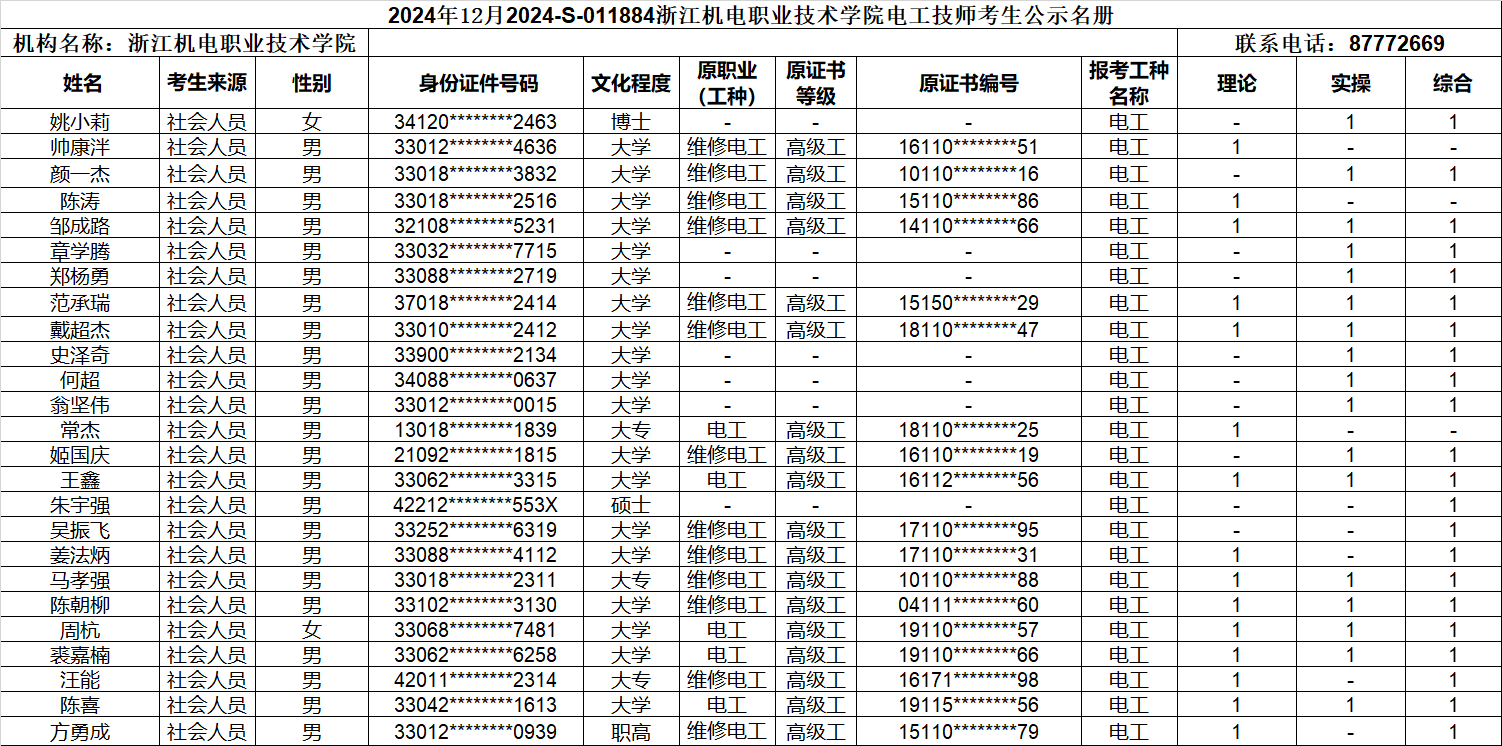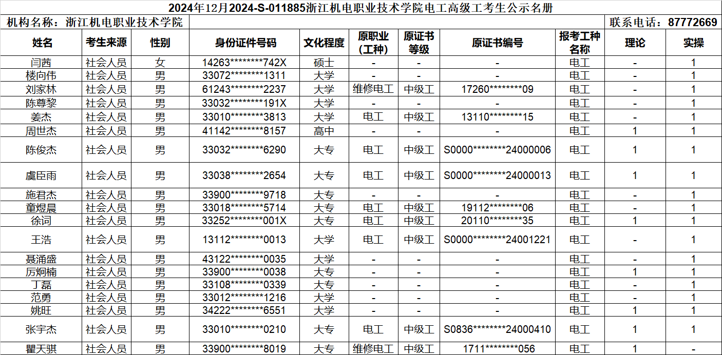 现将2024年12月社会人员电工(三级)、电工(二级)、电工(一级)职业技能等级认定考生报名结果信息予以公示,公示时间为:2024年11月25日-2024年11月29日。公示期间,有任何异议可向相关部门反映,监督电话:0571-87772669;联系人:熊老师。