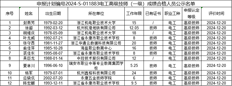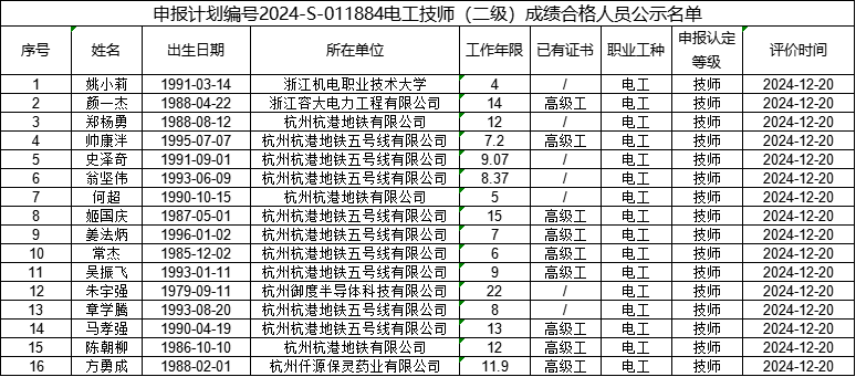 现将计划号2024-S-011885电工高级工(三级)、2024-S-011884电工技师(二级)、2024-S-011883电工高级技师(一级)职业技能等级认定社会人员考生合格人员信息(详见附件)予以公示,公示期为(2024年12月26日----2025年1月1日)。公示期间,有任何疑义可向相关部门反映,监督电话:0571-87772669。