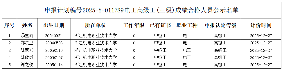 现将计划号2025-Y-011789电工工高级工(三级)、2025-Y-011788电工工中级工(四级)职业技能等级认定院校学生考生合格人员信息(详见下表)予以公示,公示期为(2025年12月30日----2026年1月5日)。公示期间,有任何疑义可向相关部门反映,监督电话:0571-87772669。