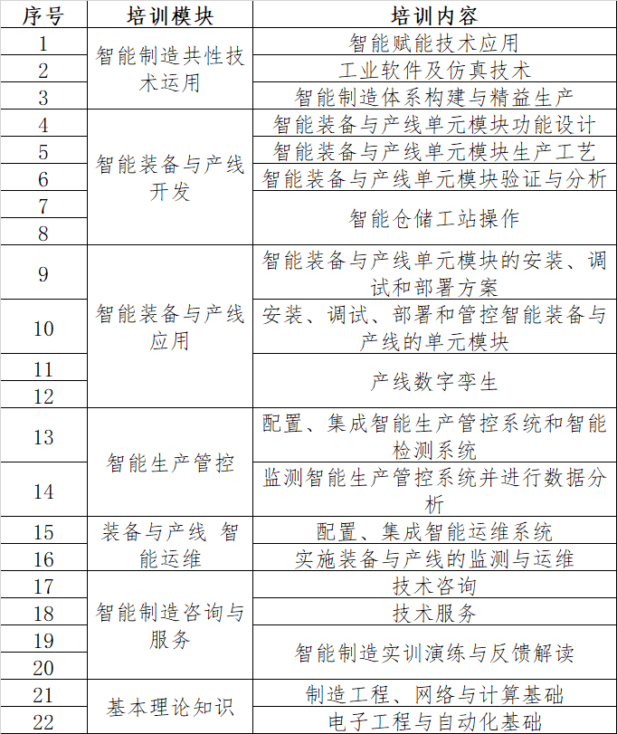根据《智能制造工程技术人员初级国家职业技术技能标准》设置培训内容,包含以下理论知识和能力实践内容,共计90学时,主要包括: