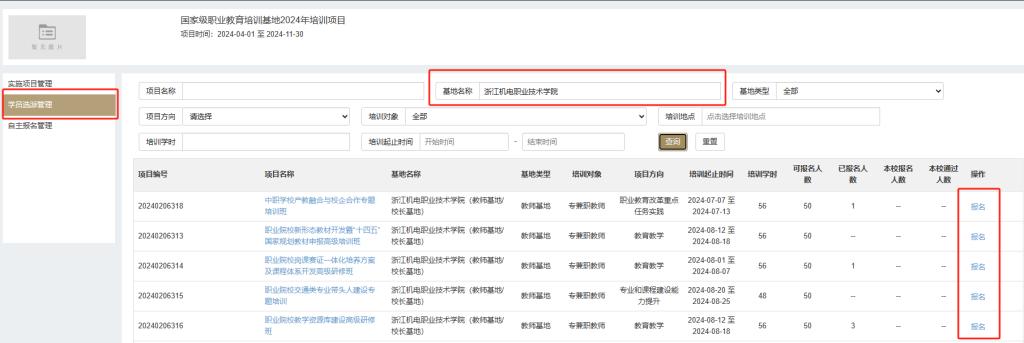 第三步:进入报名页面。点击【学员选派管理】,在基地名称中输入“浙江机电职业技术学院”,点击“查询”,点击对应培训项目右侧“报名”,进入报名页面。