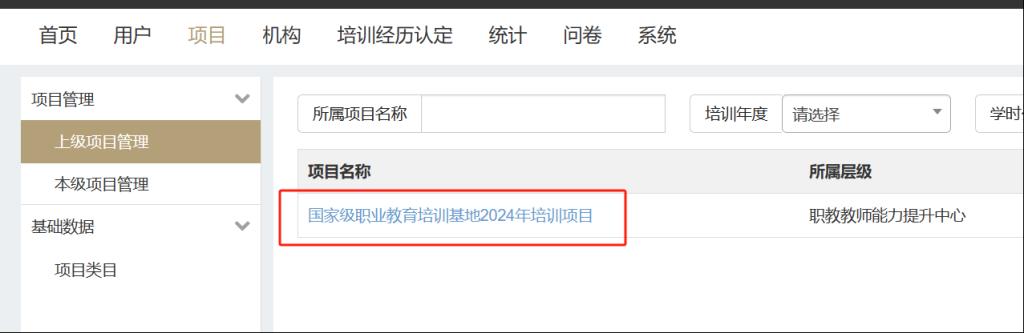 第二步:进入管理页面。在项目页面点击“国家级职业教育培训基地2024项目”,进入管理页面。