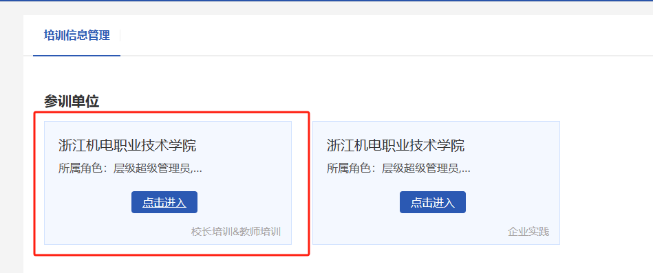 学校成功登录后,可查看到参训单位的2个入口,点击“校长培训&教师培训”入口。