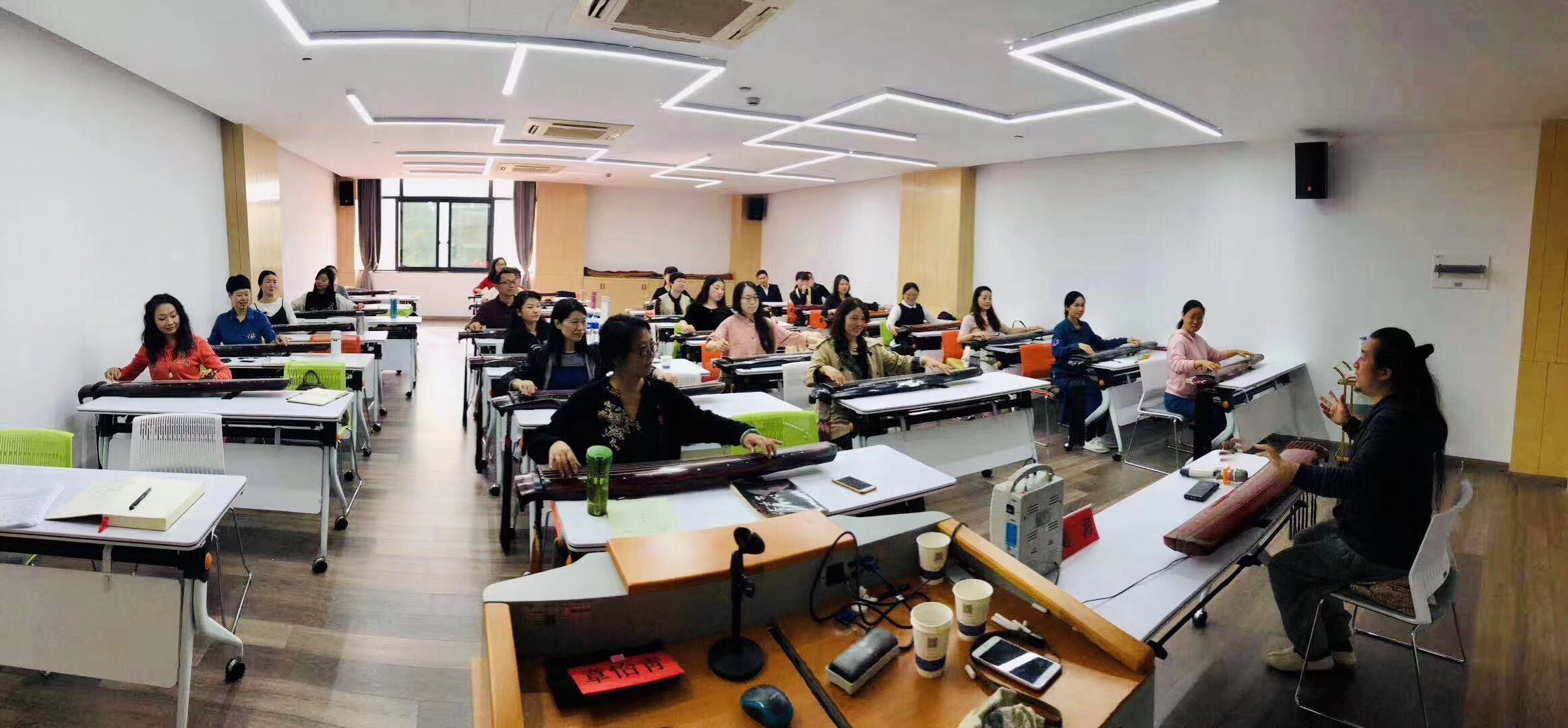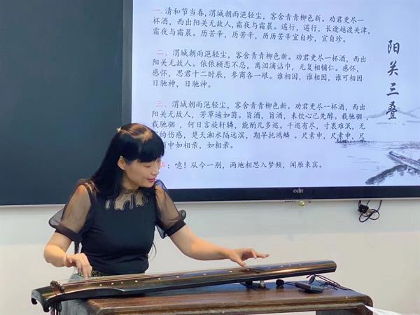 学院聘请中国琴会理事、浙江琴会会长、“浙派古琴”浙江省非物质文化遗传代表性传承人章怡青,二级演奏员、中国琴会理事、浙江省民族管弦乐协会古琴专业委员会会长章怡雯,世界音乐与药物治疗协会会员、浙江省古琴专业委员会常务理事陆海等名家前来授课。本次研修采用理实一体化教学,课程从中华民族乐器发展史、民族乐器分类解析、古琴历史解说、各朝琴曲演奏与流派讲解,到古琴减字谱学习、指法练习、经典曲目弹奏等,为初学者提供了入门级培训,培养了学员对古琴的浓厚兴趣,同时还将国学知识、处世哲学融入于课程当中,让学员在琴声悠扬中自我修养、静心正气。