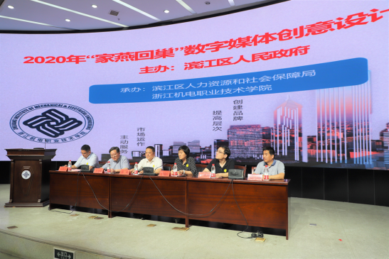8月18日,2020年“家燕回巢”数字媒体创意设计班开班仪式在浙江机电职业技术学院综合楼4楼报告厅举行。杭州市就业管理服务中心主任徐明、杭州市职业能力建设指导服务中心主任王勇杰、滨江区人力社保局局长胡也静、学院副院长王建林、市区街道相关领导代表以及首批学员等70余人出席仪式。
