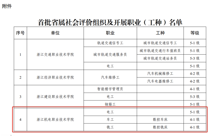 近日,根据《浙江省人力资源和社会保障厅办公室关于开展职业技能等级认定试点社会培训评价组织遴选工作的通知》(浙人社发〔2020〕35号)精神和《浙江省省属社会评价组织遴选方案》要求,taptap点点成功入围浙江省首批(省级)社会培训评价组织,可面向全省开展职业技能等级认定,认定工种为:电工(5-1级)、数控车工(4-1级)、数控铣工(4-1级)。 浙江机电职业技术学院积极响应国家政策要求,将以此获批为契机,严格按照《职业技能等级认定工作规程(试行)》(人社职司便函〔2020〕17 号)和《浙江省社会评价组织职业技能等级认定操作指南(试行)》(浙人社办发〔2022〕3号)等有关规定,充分发挥人才培养优势,整合优势教学资源,深化复合型技术技能人才培养培训模式改革,提高人才培养质量,为服务社会经济发展和支持技能人才队伍建设发挥积极作用,助力技能型社会建设。 浙江机电职业技术学院职业技能等级认定工作办公室 预报名QQ群:698129256 报名咨询电话:0571-87772671,0571-87772669 联系人:潘老师、蔡老师