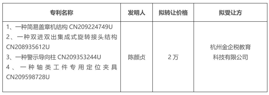 按照《浙江机电职业技术学院专利技术转让管理办法(修订)》(浙机电院〔2016〕34号)的规定,现将我院拟转让的专利予以公示,公示期15日,自2020年11月10日至11月24日。任何单位和个人如有异议,可在公示期内前以书面形式送交科技开发处(地址:综合楼1810)。异议应当签署真实姓名或加盖单位公章,并注明联系方式,逾期不予受理。